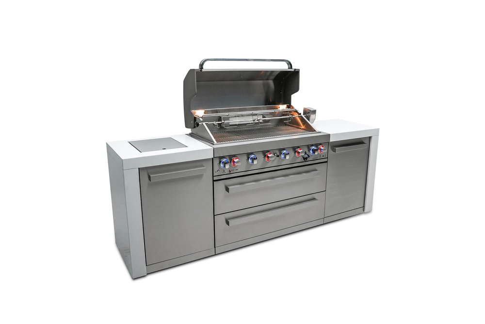 All Mont Alpi Deluxe outdoor kitchens are propane ready but can be easily converted to natural gas with the additional Mont Alpi Natural Gas conversion kit. With its white granite surfaces and waterfall sides, this grill is the perfect combination of class and convenience. Delivered fully assembled, it's the ultimate grill for any outdoor cooking enthusiast.