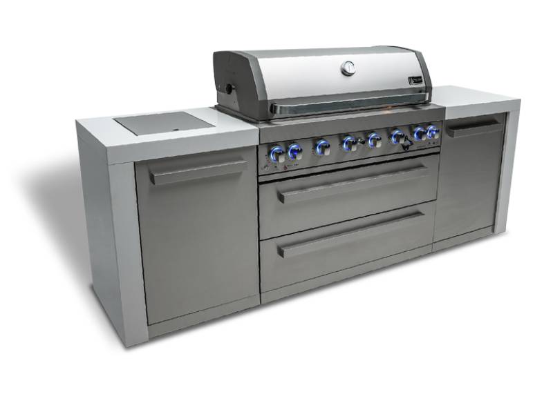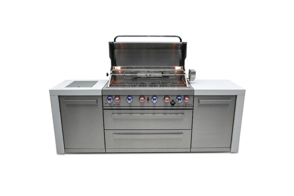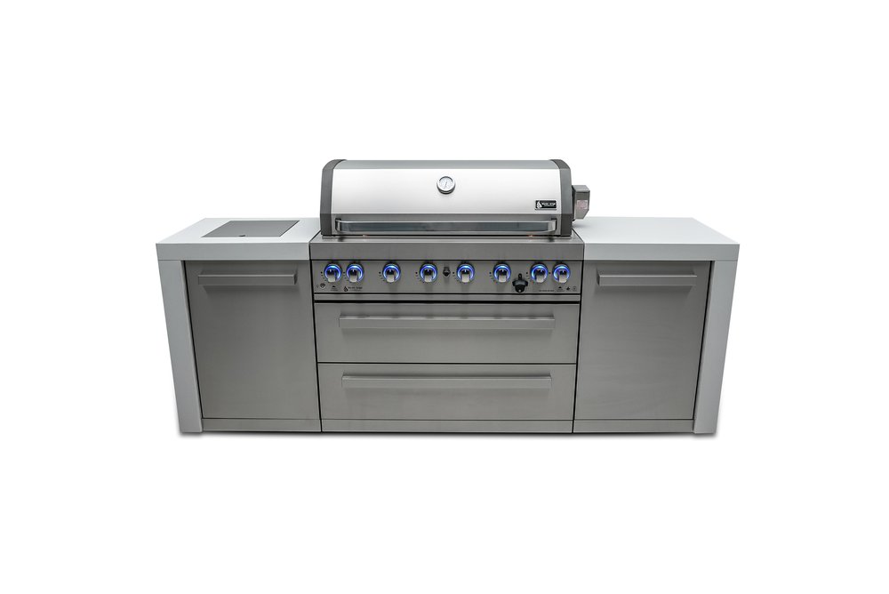 Upgrade your grilling game with the Mont Alpi 6-burner Deluxe Island. The MAi805-D features six burners, an infrared side burner for searing and boiling, and an infrared rear burner for the ultimate rotisserie experience. The grill is made of 304 Stainless Steel components and comes with a rotisserie kit, full-size weather cover, and a granite matching chopping board. LED knob lights and bright internal cooking lights provide perfect vision and precision control.