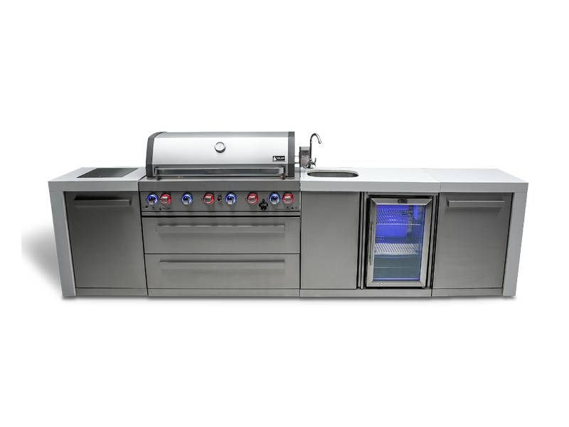 Introducing the Mont Alpi 6-burner Deluxe Island With A Beverage Center (MAi805-DBEV) – the ultimate grill for your backyard or patio! With its infrared side burner and rear burner, get ready to enjoy perfect searing, pan-frying, boiling and rotisserie experience. But that's not all – the well-appointed beverage center comes complete with an outdoor-rated fridge, sink and plenty of prep space. Plus, the LED knob lights and bright internal cooking lights make precision control a breeze.