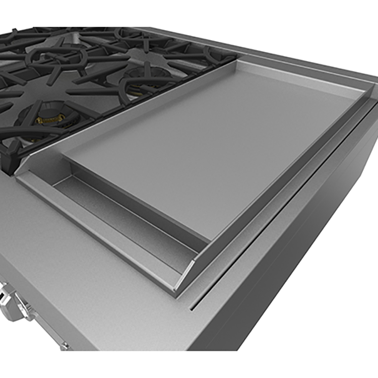 • Commercial-grade stainless steel griddle features a high-performance infrared gas burner system and thermostat for precise temperature control.