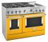 Satisfy your craving to create with a 48-inch KitchenAid® Commercial-Style Range with Even-Heat™ Chrome Electric Griddle. This 6-burner gas range features two versatile 20,000 BTU Ultra Power™ Dual-Flame Burners with the power and precision to successfully sear, simmer, stir-fry and sauté. The double oven with Even-Heat™ True Convection helps you achieve more consistent baking and roasting.
