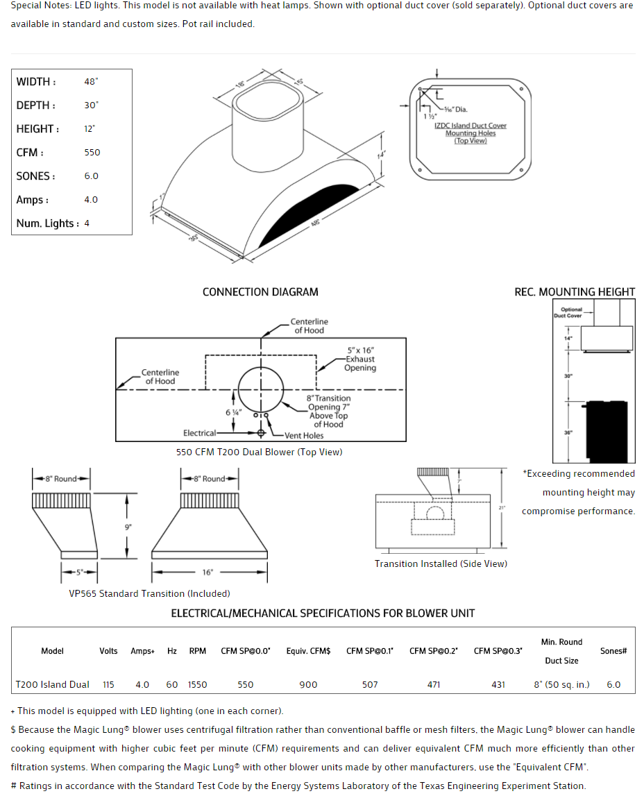 ** EQUIV CFM : Because the Magic Lung® blower uses centrifugal filtration rather than conventional baffle or mesh filters, the Magic Lung® blower can handle cooking equipment with higher cubic feet per minute (CFM) requirements and can deliver equivalent CFM much more efficiently than other filtration systems. When comparing the Magic Lung® with other blower units made by other manufacturers, use the “Equivalent CFM”.