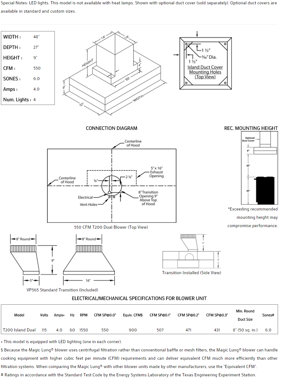 ** EQUIV CFM : Because the Magic Lung® blower uses centrifugal filtration rather than conventional baffle or mesh filters, the Magic Lung® blower can handle cooking equipment with higher cubic feet per minute (CFM) requirements and can deliver equivalent CFM much more efficiently than other filtration systems. When comparing the Magic Lung® with other blower units made by other manufacturers, use the “Equivalent CFM”.