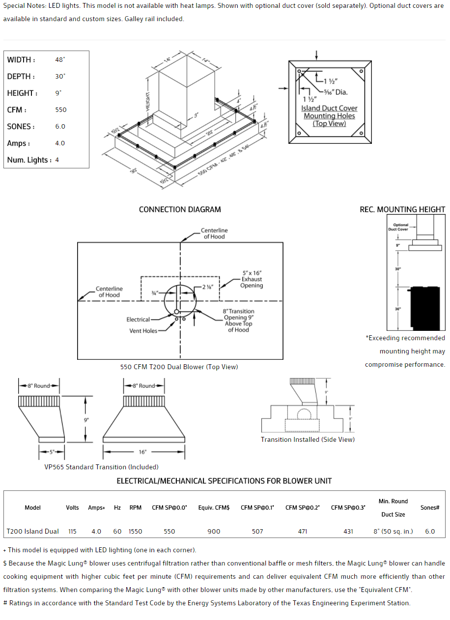 ** EQUIV CFM : Because the Magic Lung® blower uses centrifugal filtration rather than conventional baffle or mesh filters, the Magic Lung® blower can handle cooking equipment with higher cubic feet per minute (CFM) requirements and can deliver equivalent CFM much more efficiently than other filtration systems. When comparing the Magic Lung® with other blower units made by other manufacturers, use the “Equivalent CFM”.