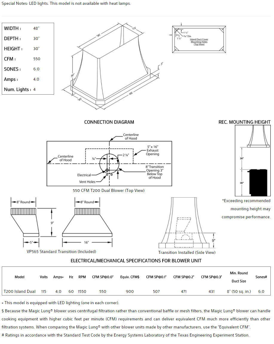 Concave with lip styling. Click on the models for a list of our base model numbers for standard sizes; simply select the model you need. This model is available in stainless steel with standard mirror stainless trim. All Vent-A-Hood Magic Lung products are suitable for use in damp locations (outdoor applications such as a covered patio) when installed in a GFCI protected branch circuit. Recommended mounting height is 30" above the cooking surface.