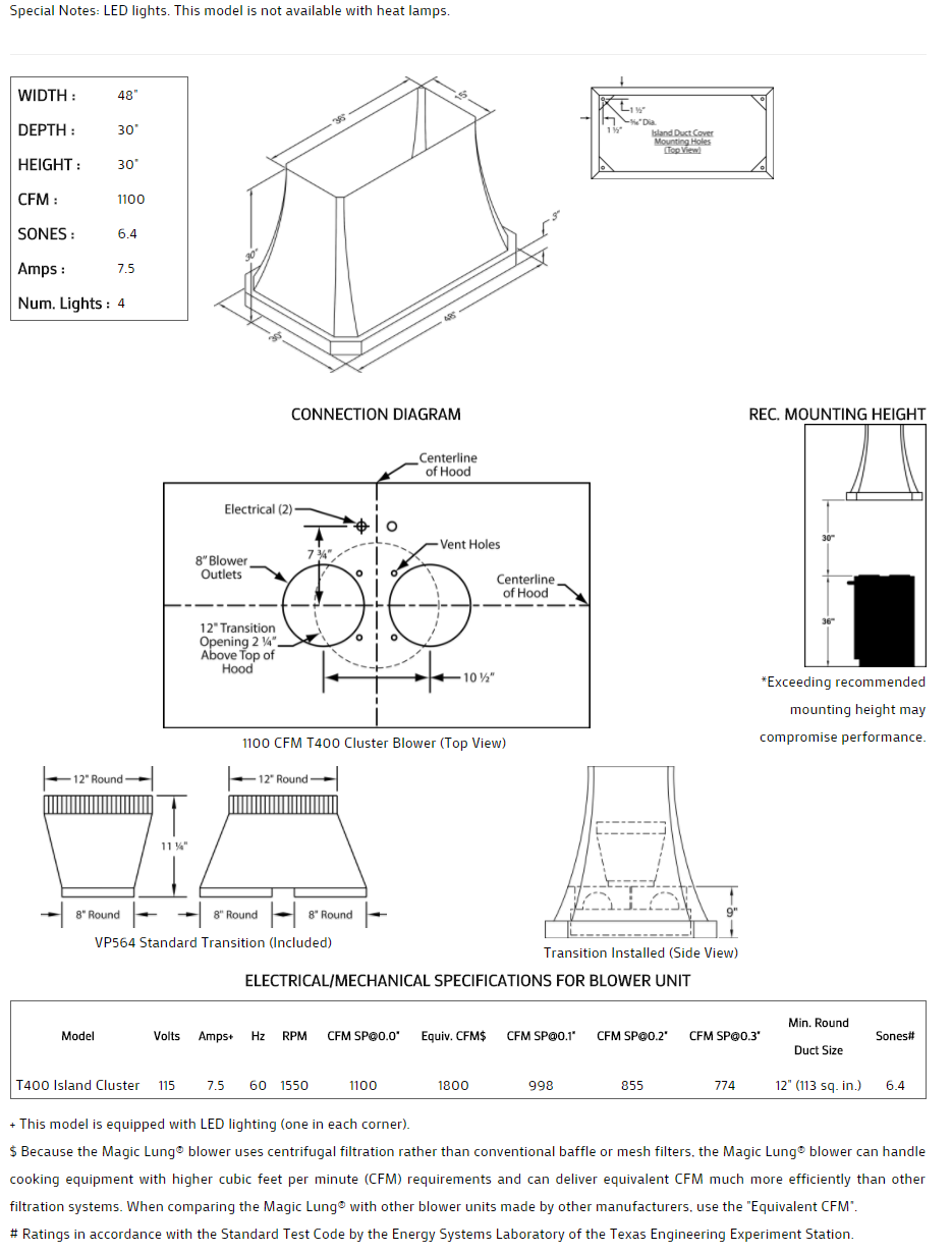 Concave with lip styling. Click on the models for a list of our base model numbers for standard sizes; simply select the model you need. This model is available in stainless steel with standard mirror stainless trim. All Vent-A-Hood Magic Lung products are suitable for use in damp locations (outdoor applications such as a covered patio) when installed in a GFCI protected branch circuit. Recommended mounting height is 30" above the cooking surface.
