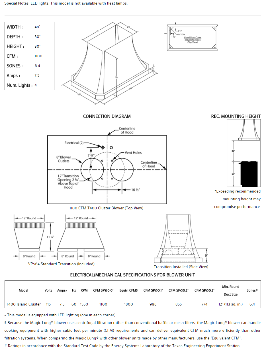 Concave with lip styling. Click on the models for a list of our base model numbers for standard sizes; simply select the model you need. This model is available in stainless steel with standard mirror stainless trim. All Vent-A-Hood Magic Lung products are suitable for use in damp locations (outdoor applications such as a covered patio) when installed in a GFCI protected branch circuit. Recommended mounting height is 30" above the cooking surface.