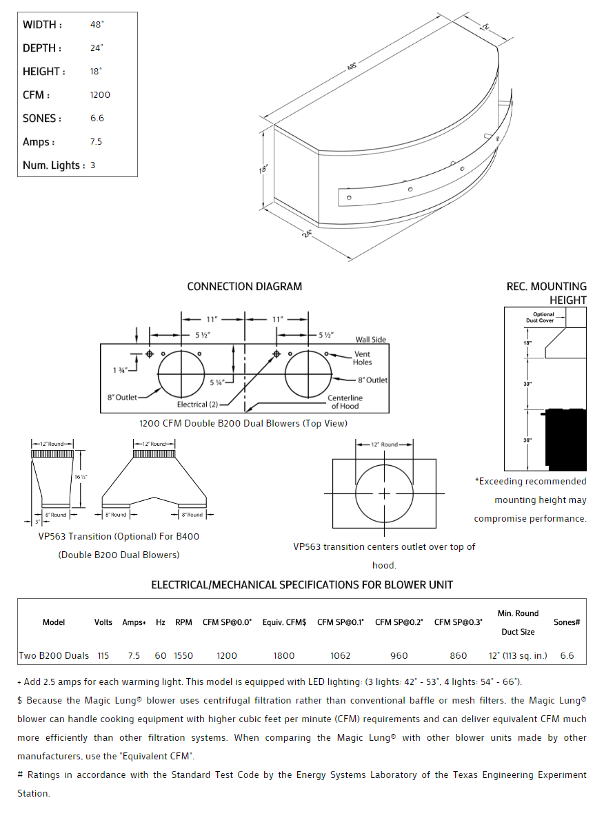 Rounded front with stand-off trim styling. Click on the models for a list of our base model numbers for standard sizes; simply select the model you need. This model is available in stainless steel with standard mirror stainless trim. All Vent-A-Hood Magic Lung products are suitable for use in damp locations (outdoor applications such as a covered patio) when installed in a GFCI protected branch circuit. Recommended mounting height is 30" above the cooking surface.