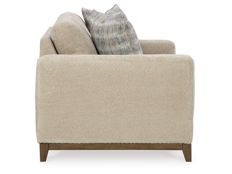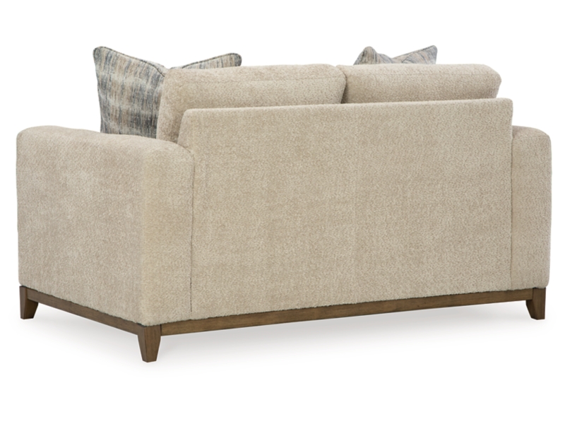 Serene style with a modern sensibility. Delight in the cozy, versatile embrace of this loveseat. It takes an on-trend approach to irresistible texture and natural beauty, showcasing soft upholstery accented with a transitional wood trim. As refined as it is laid back, the loveseat also keeps comfort a priority with plush, thick seat cushions.