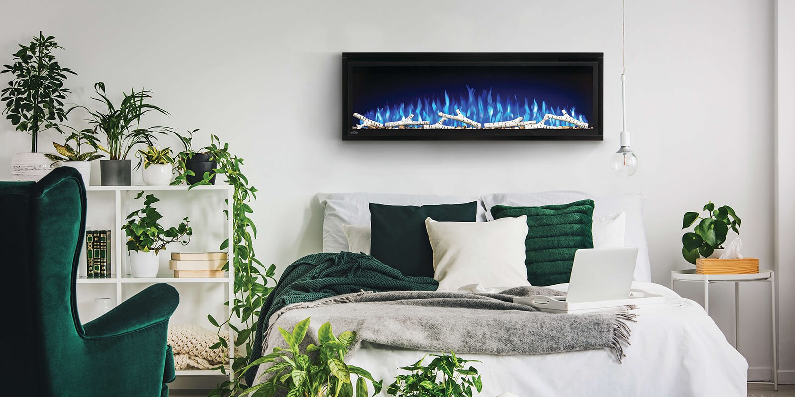Make a statement with the Napoleon Entice™ 50 Electric Fireplace. This fireplace puts out an incredible amount of heat, glittering with multicoloured flames and a crystal ember bed. You don't need a specialist or a gas fitter for this expansive beauty, just hang on the wall and plug in for instant transformation of your space. Traditional orange flames, or cool blue flames, or a combination of the two will set the mood. The shallow depth means that this fireplace doesn't intrude into your living space, but simply accents it with the expansive view of the fire. Place this electric fireplace anywhere you want to make a huge impact, perfectly suited for either your home or a commercial setting.