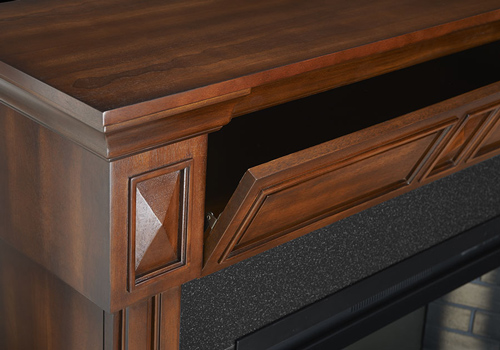 Offering a distinct mantel option, the Braxton has a modest footprint while housing the largest electric firebox in the Cinema™ family at 29 inches. The Braxton electric fireplace mantel package by Napoleon has solid hardwood decorative side columns that hold a black granite styled surround around the impressive 29” wide Cinema™ fireplace. A hidden compartment allows you to hide any possessions within or use it to hold electronic media components with the wire management system found inside.