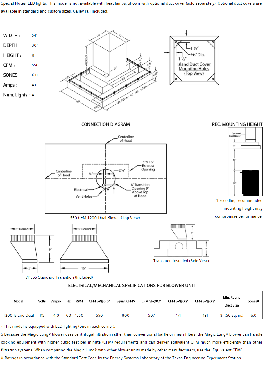 ** EQUIV CFM : Because the Magic Lung® blower uses centrifugal filtration rather than conventional baffle or mesh filters, the Magic Lung® blower can handle cooking equipment with higher cubic feet per minute (CFM) requirements and can deliver equivalent CFM much more efficiently than other filtration systems. When comparing the Magic Lung® with other blower units made by other manufacturers, use the “Equivalent CFM”.