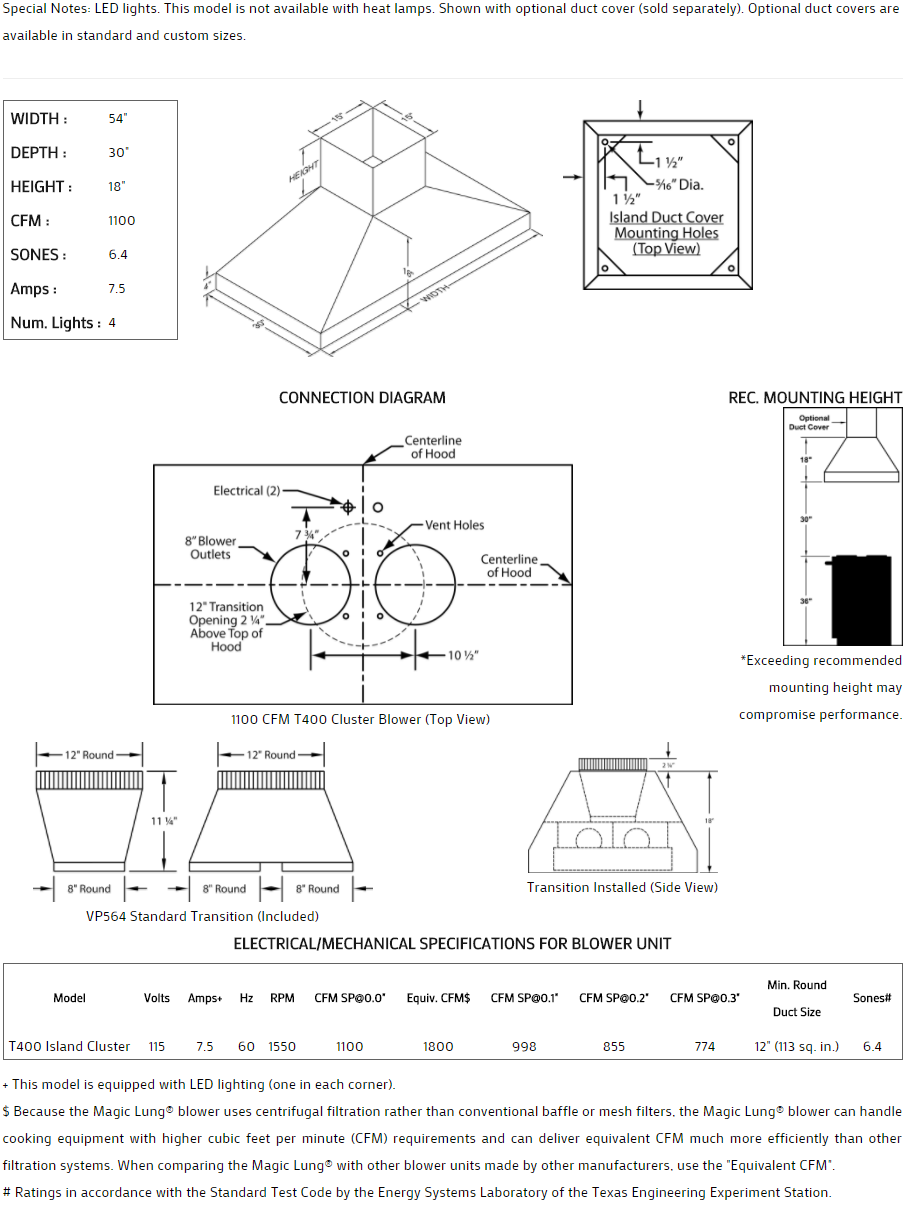** EQUIV CFM : Because the Magic Lung® blower uses centrifugal filtration rather than conventional baffle or mesh filters, the Magic Lung® blower can handle cooking equipment with higher cubic feet per minute (CFM) requirements and can deliver equivalent CFM much more efficiently than other filtration systems. When comparing the Magic Lung® with other blower units made by other manufacturers, use the “Equivalent CFM”.
