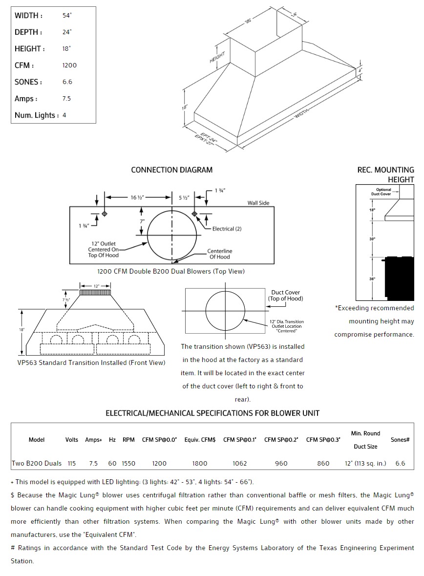 This Euroline Pro is boldly designed to cover light residential, "commercial type" cooking equipment. To order a 27" depth, add an 'X' after 'EP' in the model number. The Euroline Pro Series with Emerald Lip is also available with a 26" wide x 14" deep top to allow for higher CFM requirements . Heat lamps are not available on this model. Click on the models for a list of our base model numbers for standard sizes; simply select the model you need, and then specify the finish (painted, stainless steel, real brass, real copper, or hammered copper). Recommended mounting height is 30" from the cooking surface. Shown with matching wall mount duct cover (sold separately), available in standard sizes for 8', 9', and 10' ceiling heights or in custom sizes. All Vent-A-Hood products are suitable for use in damp locations (outdoor applications such as a covered patio) when installed in a GFCI protected branch circuit.
