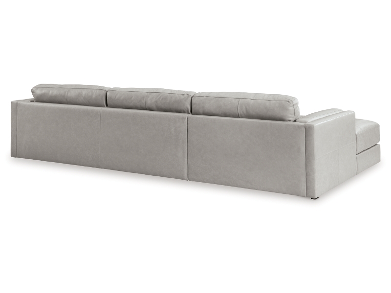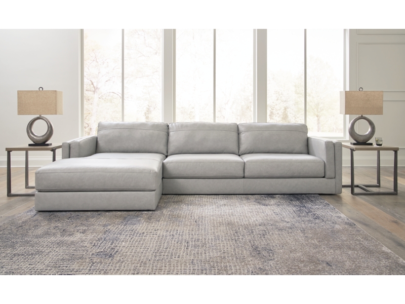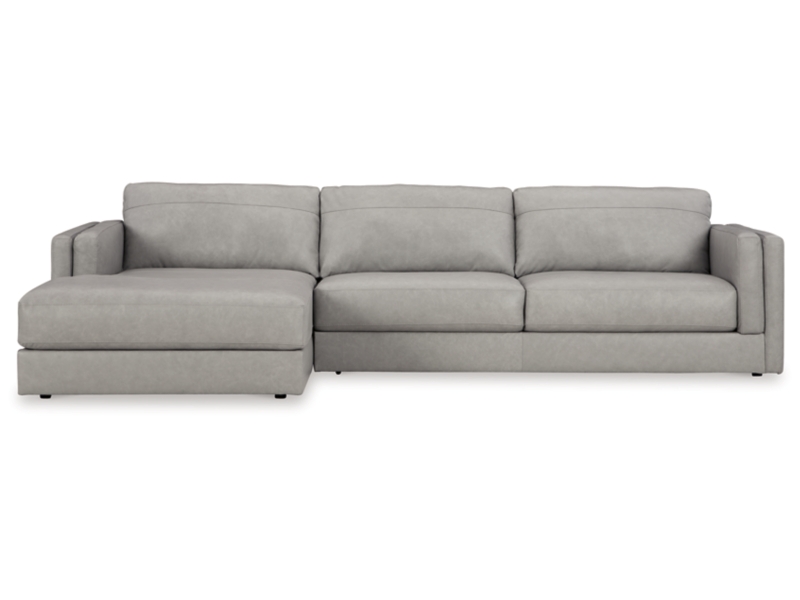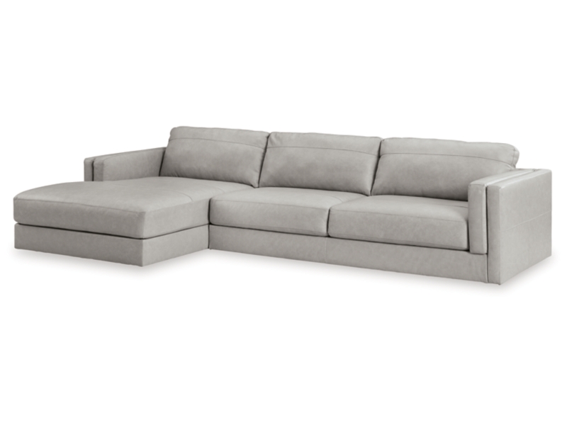 Keen on crisp, contemporary design? Adore the pleasure of leather? Look no further. This sectional with chaise satisfies on every level. Richly textured and decadently supple, the plush cushions are wrapped with expertly matched leather and faux leather upholstery in an on-trend neutral tone. Sleek double-padded arms and a low, clean-lined profile complete this spacious sectional's simply chic appeal.