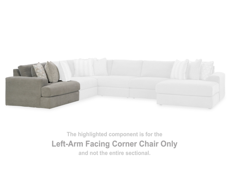 This left-arm facing corner chair is made with polyester chenille and polyester upholstery. Fully finished on all sides, it pairs with other items in the series to make a modular sectional.