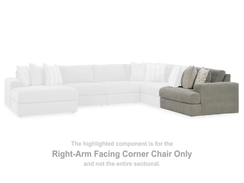 This right-arm facing corner chair is made with polyester chenille and polyester upholstery. Fully finished on all sides, it pairs with other items in the series to make a modular sectional.