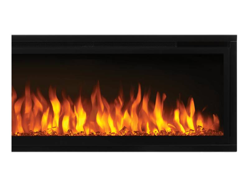 Make a statement with the Napoleon Entice™ 60 Electric Fireplace. This fireplace puts out an incredible amount of heat, glittering with multicoloured flames and a crystal ember bed. You don't need a specialist or a gas fitter for this expansive beauty, just hang on the wall and plug in for instant transformation of your space. Traditional orange flames, or cool blue flames, or a combination of the two will set the mood. The shallow depth means that this fireplace doesn't intrude into your living space, but simply accents it with the expansive view of the fire. Place this electric fireplace anywhere you want to make a huge impact, perfectly suited for either your home or a commercial setting.