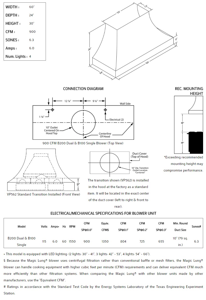 Concave with thick lip styling. Click on the models for a list of our base model numbers for standard sizes; simply select the model you need. This model is available in stainless steel with standard mirror stainless trim. All Vent-A-Hood Magic Lung products are suitable for use in damp locations (outdoor applications such as a covered patio) when installed in a GFCI protected branch circuit. Recommended mounting height is 30" above the cooking surface.