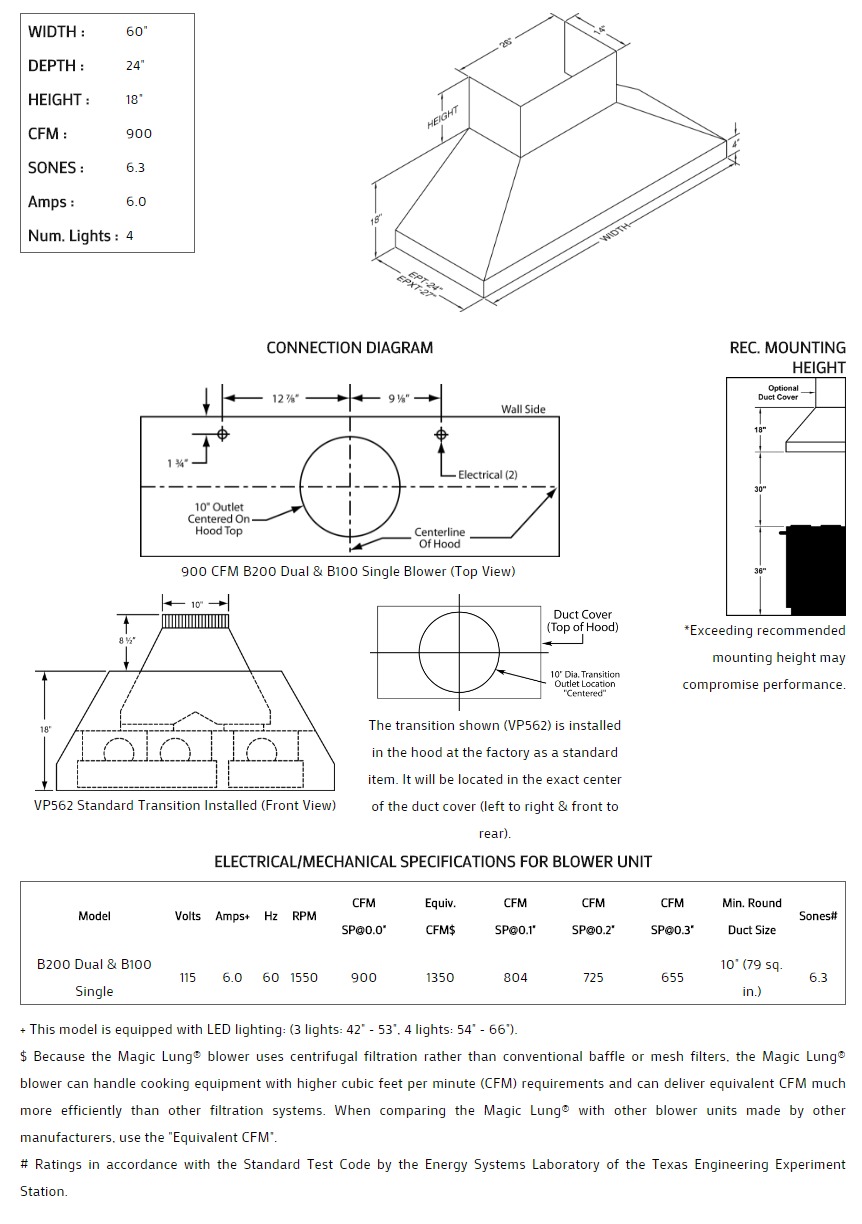 This Euroline Pro is boldly designed to cover light residential, "commercial type" cooking equipment. To order a 27" depth, add an 'X' after 'EP' in the model number. The Euroline Pro Series with Emerald Lip is also available with a 26" wide x 14" deep top to allow for higher CFM requirements . Heat lamps are not available on this model. Click on the models for a list of our base model numbers for standard sizes; simply select the model you need, and then specify the finish (painted, stainless steel, real brass, real copper, or hammered copper). Recommended mounting height is 30" from the cooking surface. Shown with matching wall mount duct cover (sold separately), available in standard sizes for 8', 9', and 10' ceiling heights or in custom sizes. All Vent-A-Hood products are suitable for use in damp locations (outdoor applications such as a covered patio) when installed in a GFCI protected branch circuit.