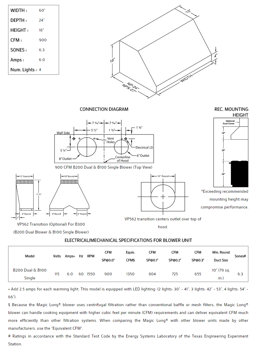 Rounded front lip provides a modern visual impact. Includes the Magic Lung® blower system. Lights feature a dual switch for dimming. Equipped with the SensaSource® heat sensor. Available in popular standard or custom paint colors, stainless steel, real brass, real copper or hammered copper. Recommended mounting height is 30" above the cooking surface. Suitable for use in covered outdoor applications when installed in a GFCI protected branch circuit. Also available in custom sizes.