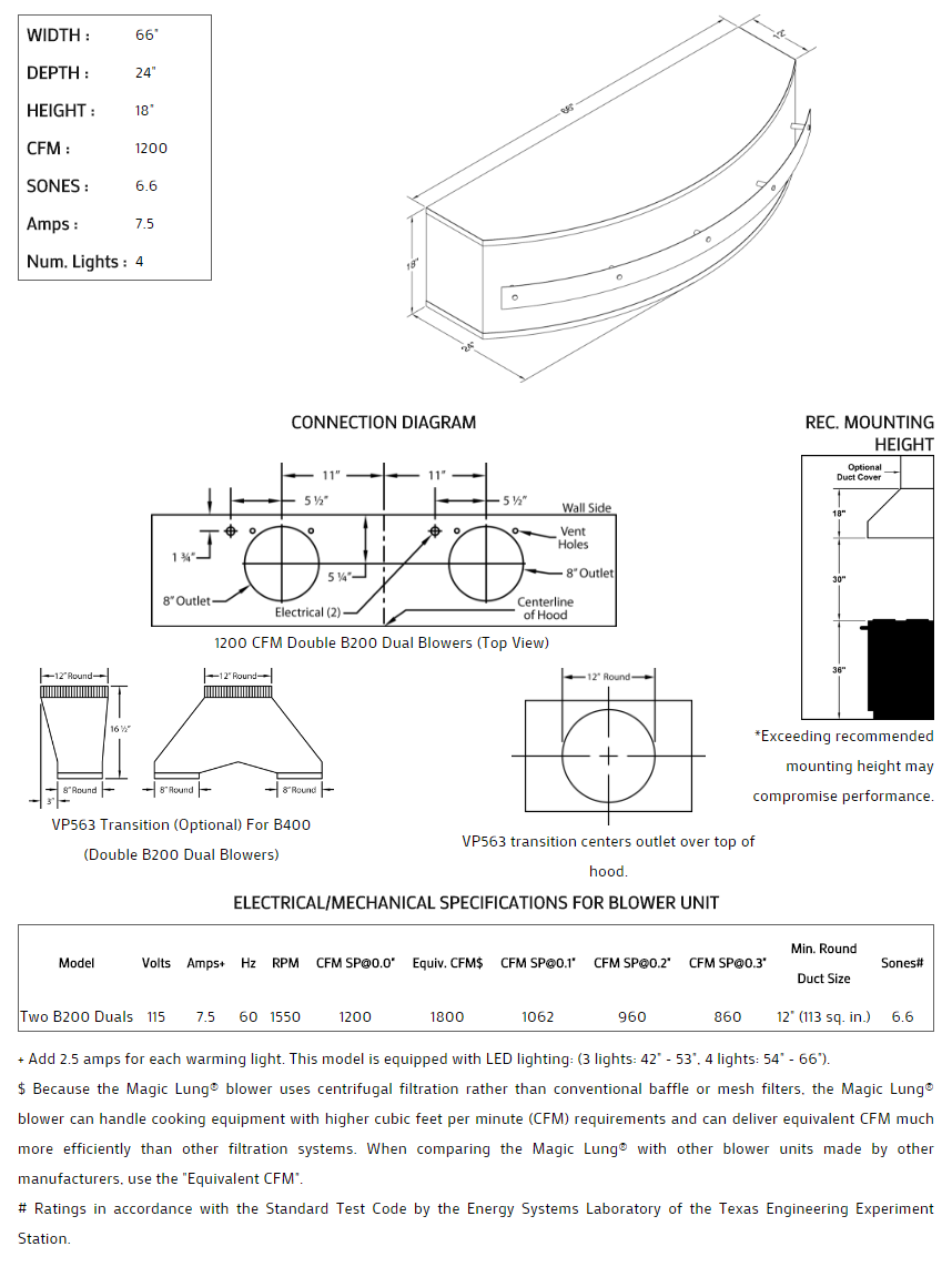 Rounded front with stand-off trim styling. Click on the models for a list of our base model numbers for standard sizes; simply select the model you need. This model is available in stainless steel with standard mirror stainless trim. All Vent-A-Hood Magic Lung products are suitable for use in damp locations (outdoor applications such as a covered patio) when installed in a GFCI protected branch circuit. Recommended mounting height is 30" above the cooking surface.