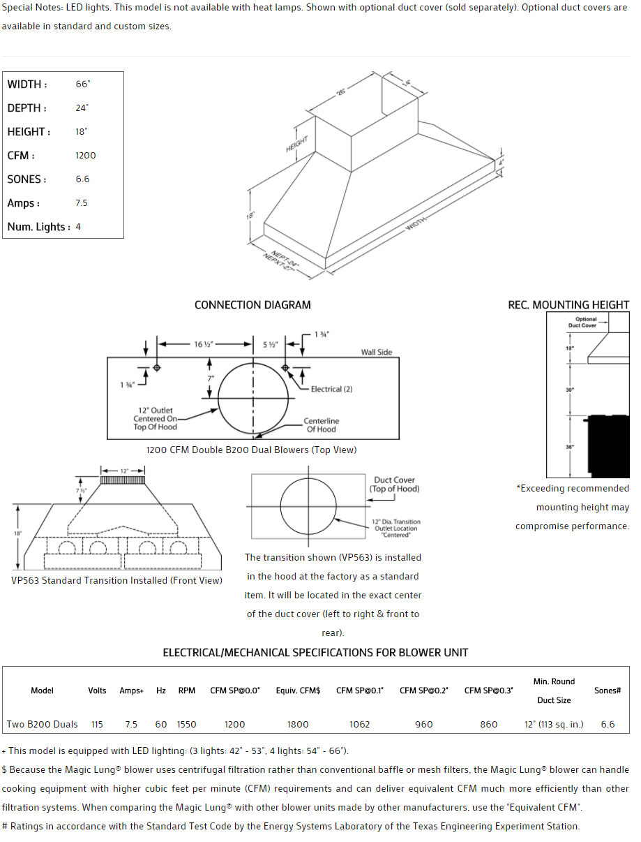 ** EQUIV CFM : Because the Magic Lung® blower uses centrifugal filtration rather than conventional baffle or mesh filters, the Magic Lung® blower can handle cooking equipment with higher cubic feet per minute (CFM) requirements and can deliver equivalent CFM much more efficiently than other filtration systems. When comparing the Magic Lung® with other blower units made by other manufacturers, use the “Equivalent CFM”.