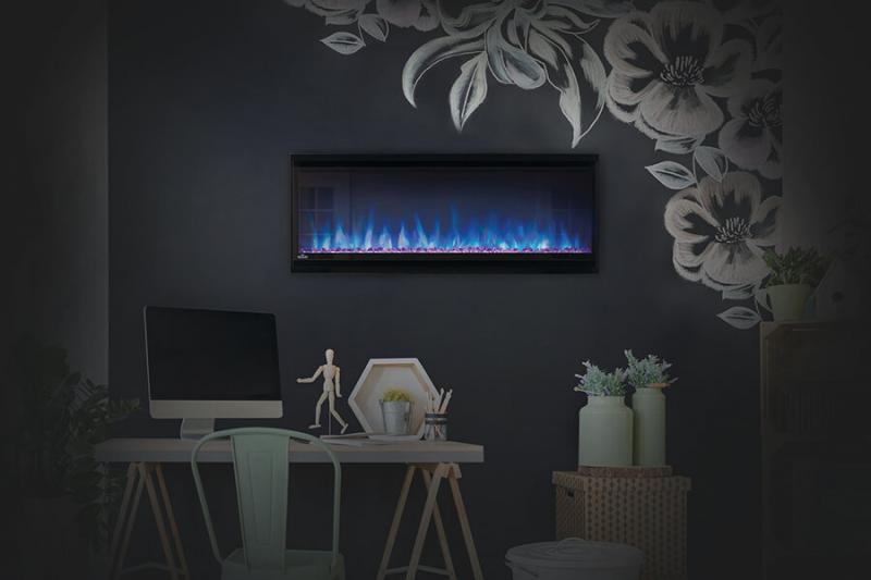 Napoleon’s Alluravision 74 Slimline linear electric fireplace allows you to see the fireplace and not the frame with its nearly frameless linear design. As a contemporary electric fireplace, the frameless modern look is just as important as its functionality. Easy to use, the plug and play installation allows this unit to be hung on the wall and turned on immediately. Its slim design barely protrudes into the room. The Alluravision 74 can also be hardwired in to hide plugs. Select from four flame colours, yellow, orange, blue, and multi-coloured and with five different flame speeds, further ensure the perfect atmosphere for any space. Illuminate the firebox without flame using the NIGHT LIGHT to boost ambient light and create a warm glow. Enjoy the Alluravision 74 all year round with separate flame and heat controls.
