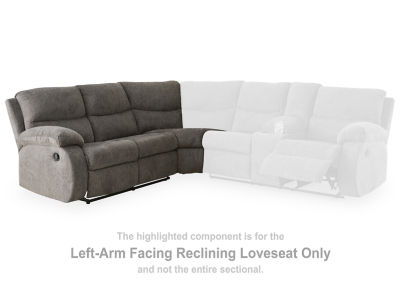 This left-arm facing reclining loveseat with half wedge is made with polyester upholstery. Pairs with other items in the series to make a sectional.