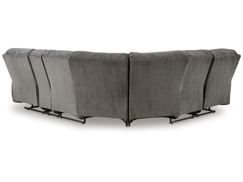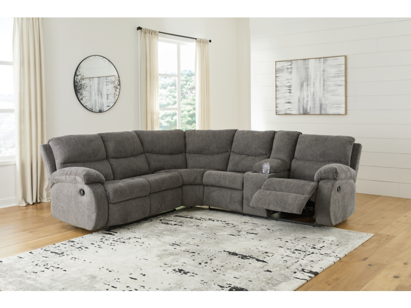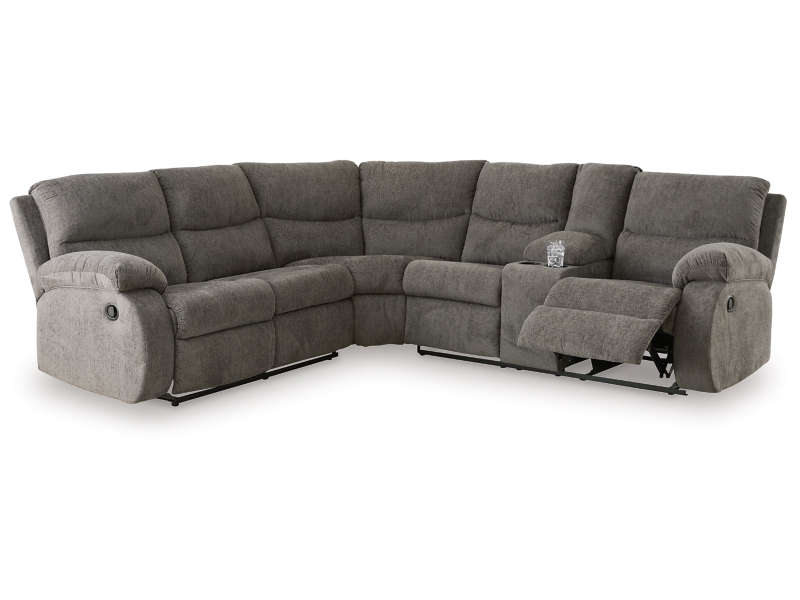 Cozy comfort is on the rise with this reclining sectional. So velvety soft, the trendy pewter-hued chenille upholstery is made for everyday indulgence. Overstuffed and stylishly wrapped, the sumptuous cushions and pillow top armrests display the comfortable side of contemporary. A padded center console with hidden storage and dual cup holders blends form and function. And with one easy pull, you're on your way to endless relaxation with plenty of room to stretch out.