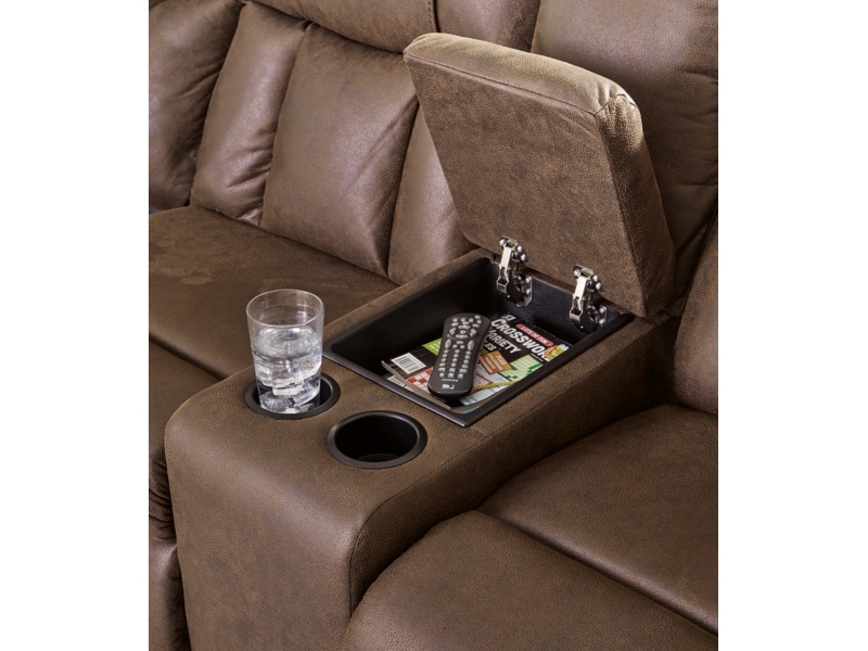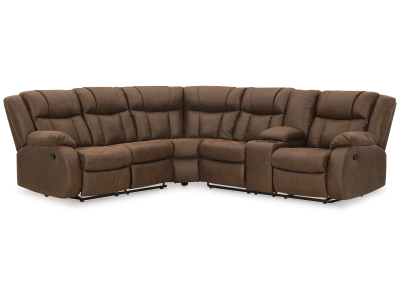 Melt into comfort at the end of your day. Accented by jumbo stitching, the supple walnut faux leather and sumptuous cushioning cradle your body in infinite positions of leisure. Simply pull the tab to recline. With dual cup holders and convenient console storage, this reclining sectional makes relaxation your sweet reward for all you do.