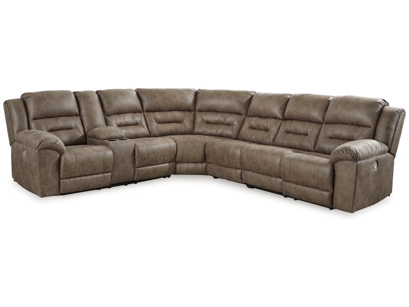 This power reclining sectional is designed exclusively for those who are serious about R&R. Its overstuffed cushions and pillow top arms feel oh-so-plush, and the faux leather upholstery accented with jumbo stitching is silky soft. Go from upright to reclined relaxation with just one touch. A clever center console provides storage and keeps drinks at the ready.