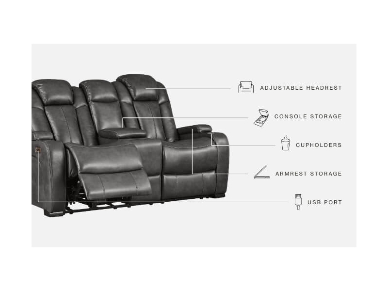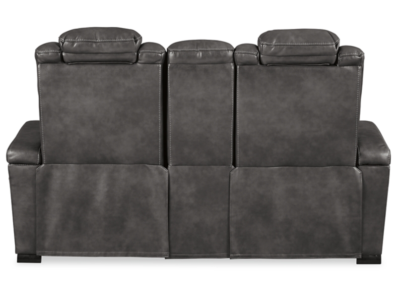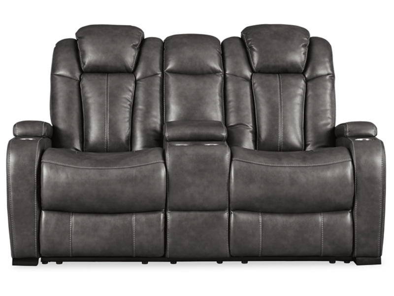 Looking for seating with all the bells and whistles? This power reclining loveseat has you covered. Get double the relaxation as you recline your body and adjust your headrest. Pull up the center console to stash your remotes. With USB charging ports, your devices will enjoy this loveseat, too. Stainless steel cup holders accompany you on either side. It's all wrapped up in quality faux leather with fashion-forward jumbo stitching, for a look and feel you’ll love.