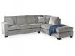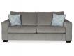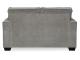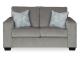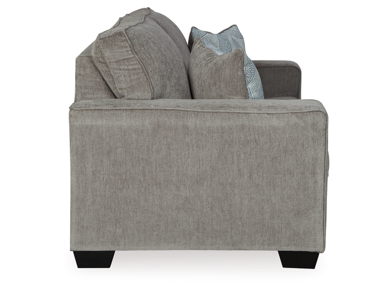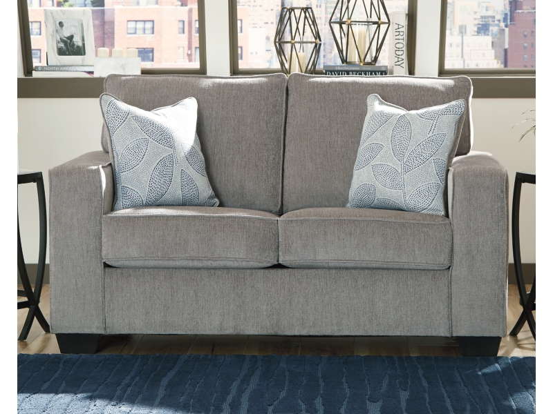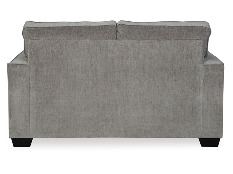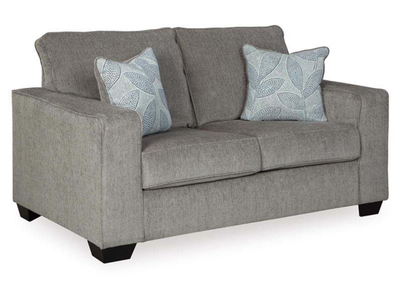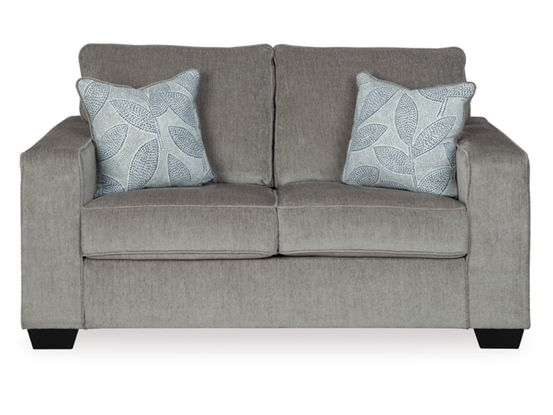 If style is the question, then this striking loveseat is the answer. Sporting clean lines and sleek track arms, the decidedly contemporary profile is enhanced with plump cushioning and a chenille-feel upholstery that's so pleasing to the touch. Sure to play well with so many color schemes, this loveseat in richly neutral alloy includes a pair of understated floral pattern pillows for fashionably fresh appeal.