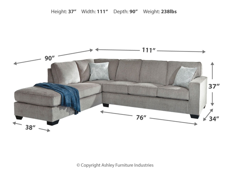 If style is the question, then this sectional is the answer. Sporting clean lines and sleek track arms, the decidedly contemporary profile is enhanced with plump cushioning and a chenille-feel upholstery that's so pleasing to the touch. Sure to play well with so many color schemes, this sectional in richly neutral alloy includes a pair of understated floral pattern pillows for fashionably fresh appeal.