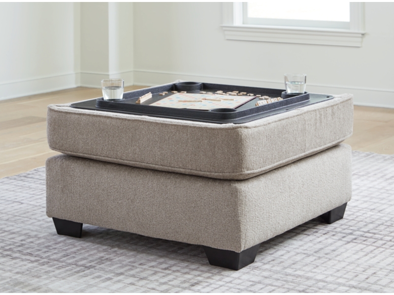 Looking for furniture with extra benefits? This ottoman delivers more than meets the eye, with concealed storage and cup holders beneath the removable cushioned top. With soft upholstery and a generous scale, it greatly enhances your lounge space when paired with seating.