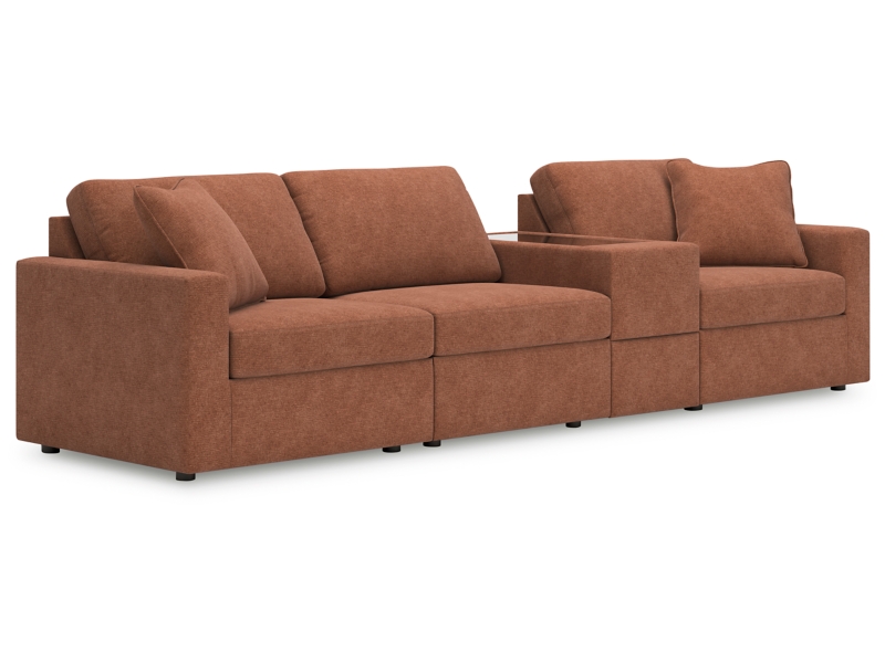 - Includes 4 modular pieces: left-arm facing corner chair, armless chair, console with storage and right-arm facing corner chair