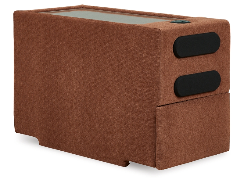 - Console with plexiglass top; pull-out drawer for storage; built-in audio sound system with wireless connectivity; audio controls located on console; USB charging