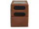 - Console with plexiglass top; pull-out drawer for storage; built-in audio sound system with wireless connectivity; audio controls located on console