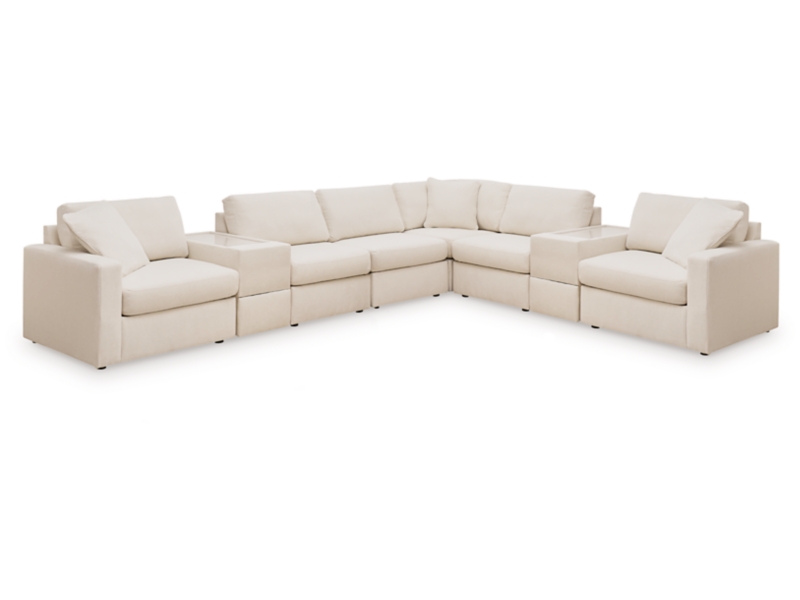 - Includes 8 modular pieces: left-arm facing corner chair, 3 armless chairs, 2 consoles with storage, wedge and right-arm facing corner chair