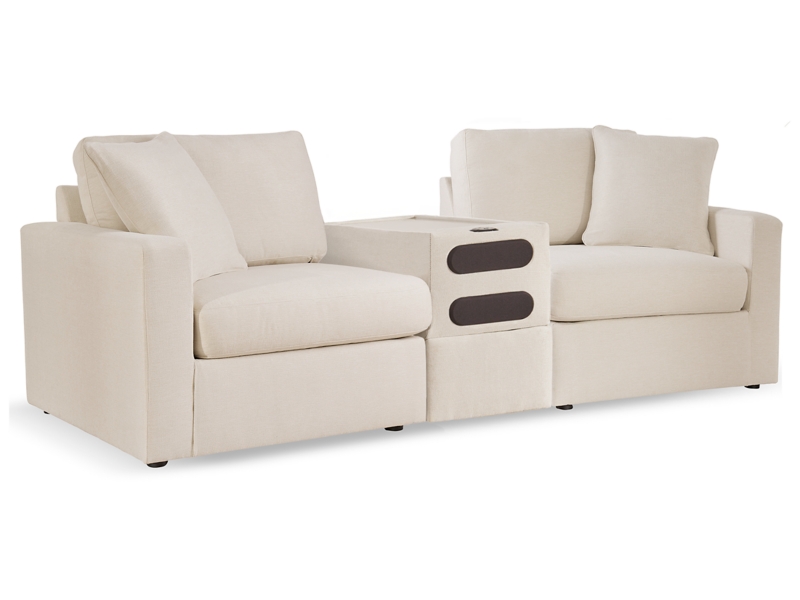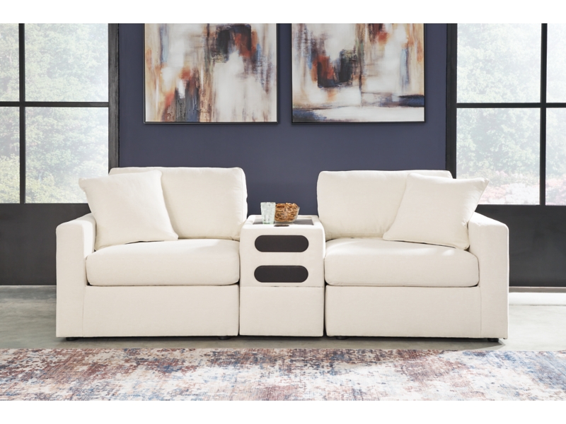 - Includes 3 modular pieces: left-arm facing corner chair, audio console with storage and right-arm facing corner chair