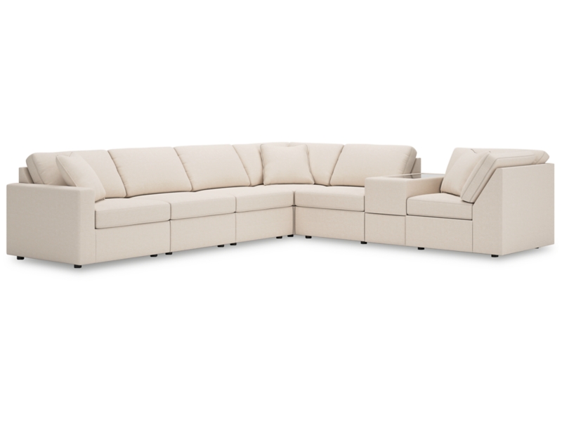 - Includes 7 modular pieces: left-arm facing corner chair, 3 armless chairs, console with storage and 2 wedges