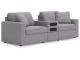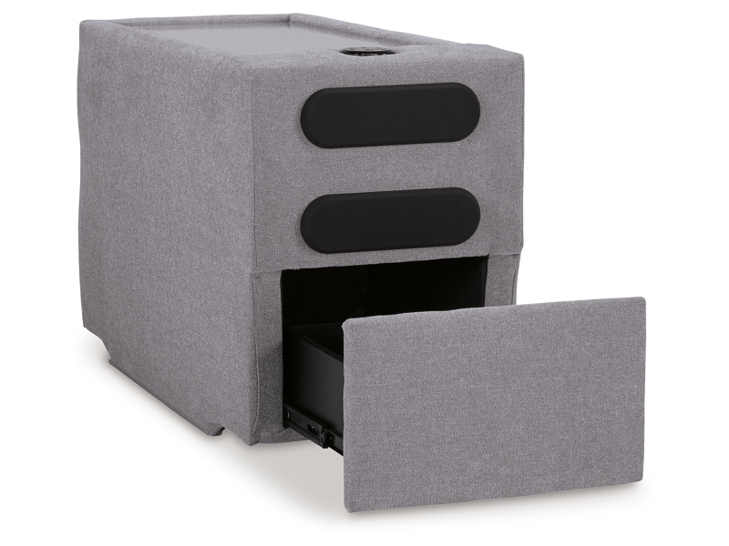- Includes 3 modular pieces: left-arm facing corner chair, audio console with storage and right-arm facing corner chair