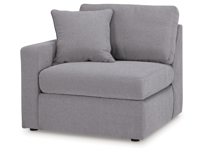 - Includes 4 modular pieces: left-arm facing corner chair, armless chair, audio console with storage and right-arm facing corner chaise