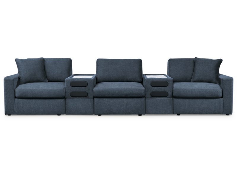- Includes 5 modular pieces: left-arm facing corner chair, armless chair, 2 audio consoles with storage and right-arm facing corner chair
