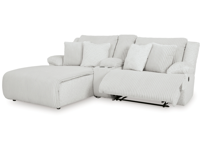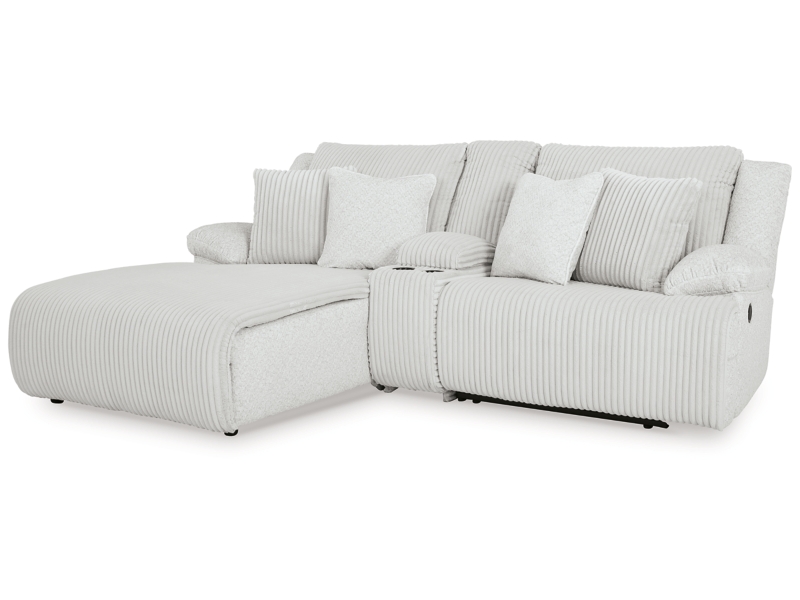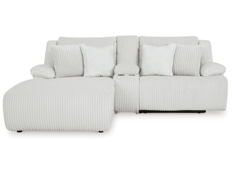 - Includes 3 pieces: left-arm facing press back chaise, console with storage and right-arm facing recliner
