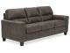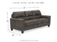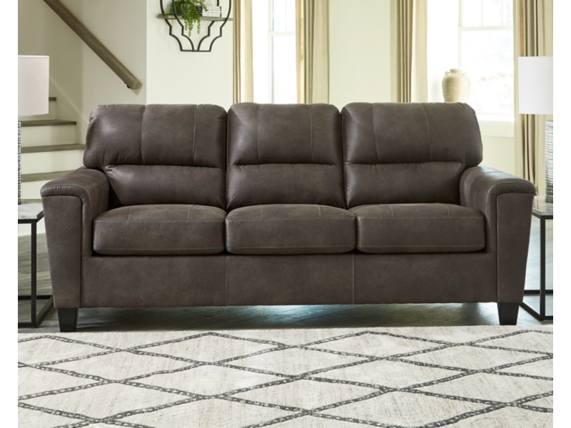 If you love the cool look of leather but long for the warm feel of fabric, you can take comfort in this sofa. Wrapped in a fabulous faux leather with a weathered hue and hint of pebbly texture to resemble the real deal, this decidedly modern sofa proves less is more. Elements include angled side profiling and track armrests wrapped with a layer of pillowy softness for that little something extra. Prominent jumbo stitching and clean-lined divided back styling lend fashion-forward flair.