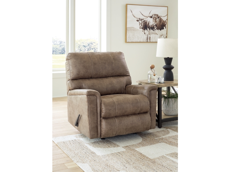 This decidedly modern recliner proves less is more, bringing simply inviting style to your living room. Take the guesswork out of decorating—its warm faux leather has a universal appeal, pairing with casual and contemporary aesthetics alike. And with the recliner's easy one-pull reclining, all you need to do is kick back and enjoy the comforts of home.