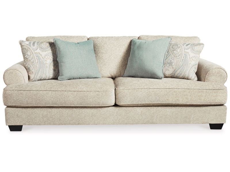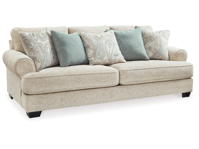 This sofa strikes a beautiful balance between classic and current. Its traditional elements include t-cushion seating and setback roll arms, angled for modern flair. Posh pillows in spa mist and jacquard paisley make a muted, mellow complement to the sofa’s casual textured chenille upholstery. And the choice of sandstone beige is a light and lovely style awakening.