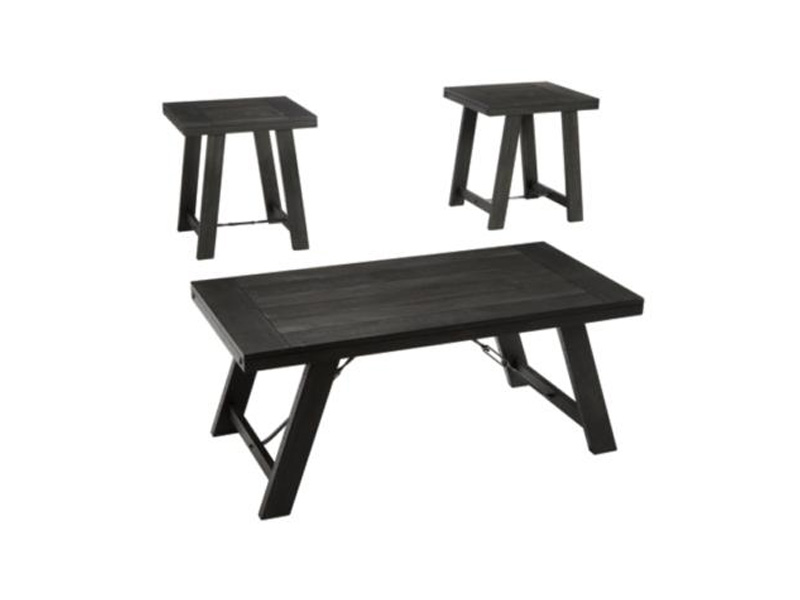 T351-13 Includes coffee table and 2 end tables;Made of Acacia veneers, wood and engineered wood;Distressed black wash finish;Canted legs with stretchers;Tops have a bread board layup with a planked effect;Coffee table with tension bars;Assembly required